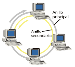 - Topología en anillo. Conforma el mismo sistema que la del bus, sólo que esta acaba de forma cerrada como si fuera un anillo, es decir, no tiene terminadores. La información circula en un sentido y cada ordenador analiza si es él el destinatario de la información. En caso negativo, esta se deja pasar al siguiente equipo hasta encontrar así su destinatario.