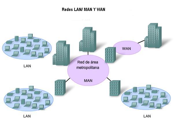 - Redes de área metropolitana (MAN), que se extienden por toda la ciudad. Un tipo de red intermedia entre la LAN y la MAN es la CAN, que ocupa varios edificios del campus universitario o de una ciudad empresarial.
