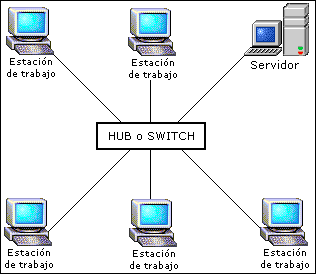 - Topología en estrella. En este tipo todos los ordenadores van conectados a un único dispositivo encargado de transmitir la información, que suele ser un hub o un switch.